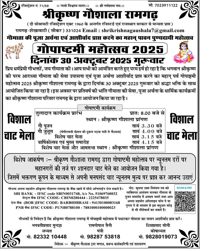 रामगढ़ शेखावाटी। श्रीकृष्ण गोशाला रामगढ़ में आगामी गुरुवार, 30 अक्टूबर 2025 को भव्य गोपाष्टमी महोत्सव 2025 का आयोजन किया जाएगा। यह धार्मिक पर्व गौमाता की पूजा-अर्चना और आशीर्वाद प्राप्त करने का पावन अवसर होगा।
