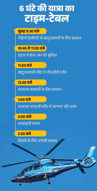 रोहिणी से उड़ान, 52 बीघा पार्किंग में होगी लैंडिंग हेलिकॉप्टर की उड़ान दिल्ली के रोहिणी हेलीपोर्ट से शुरू होगी। यहां से सुबह 9:30 बजे प्रस्थान होगा, और शाम तक वापसी हो जाएगी। खाटूश्यामजी में 52 बीघा पार्किंग स्थित हेलीपैड पर लैंडिंग होगी। पूरी यात्रा का कार्यक्रम तय है, ताकि समय की बर्बादी न हो। यह सेवा स्यंदन एविएशन प्राइवेट लिमिटेड द्वारा संचालित की जा रही है। कंपनी देशभर में निजी हेलिकॉप्टर चार्टर सेवाएं प्रदान करती है। इसमें तीर्थ यात्राएं, सरकारी चार्टर, हवाई सर्वेक्षण और लग्जरी ट्रैवल